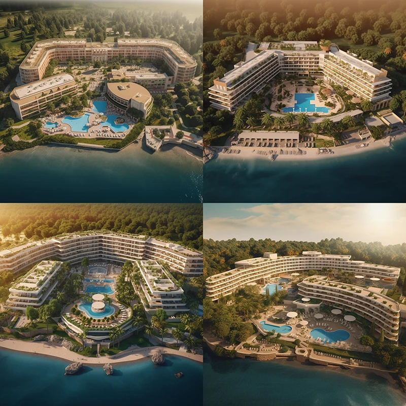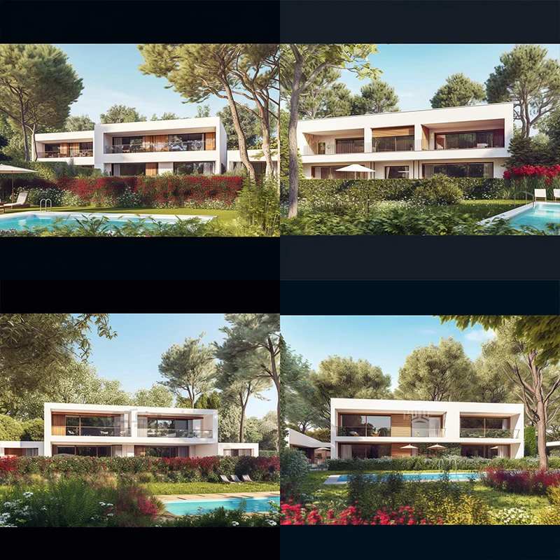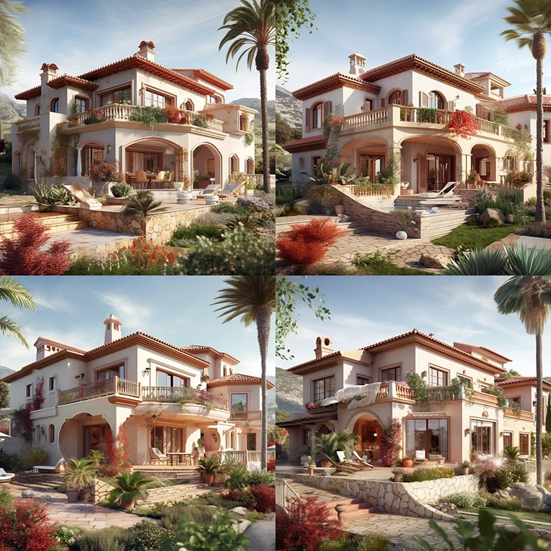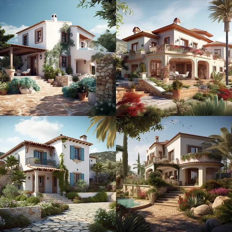 To demonstrate, let’s consider how one of our artists used Midjourney to create a portfolio piece. The artist inputted the following keywords: “Mediterranean home summer seaside high-quality render”. Based on this, the AI generated four options.